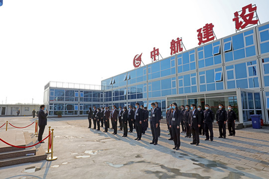 2020年4月10日,中航建设集团在脑认知功能图谱与类脑智能交叉研究平台刚刚落成的项目部办公楼前举行庄严的升旗仪式,机关副部长级以上、分(子)公司经理级以上管理人员及项目部成员参加。